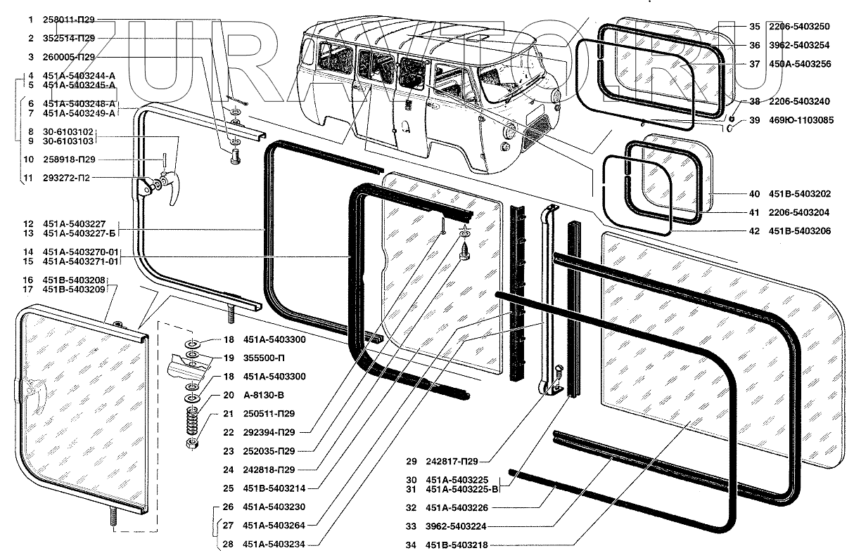 | 17 | 451В-5403209 | Стекло окна боковины поворотное левое в сборе | Нет в продаже |