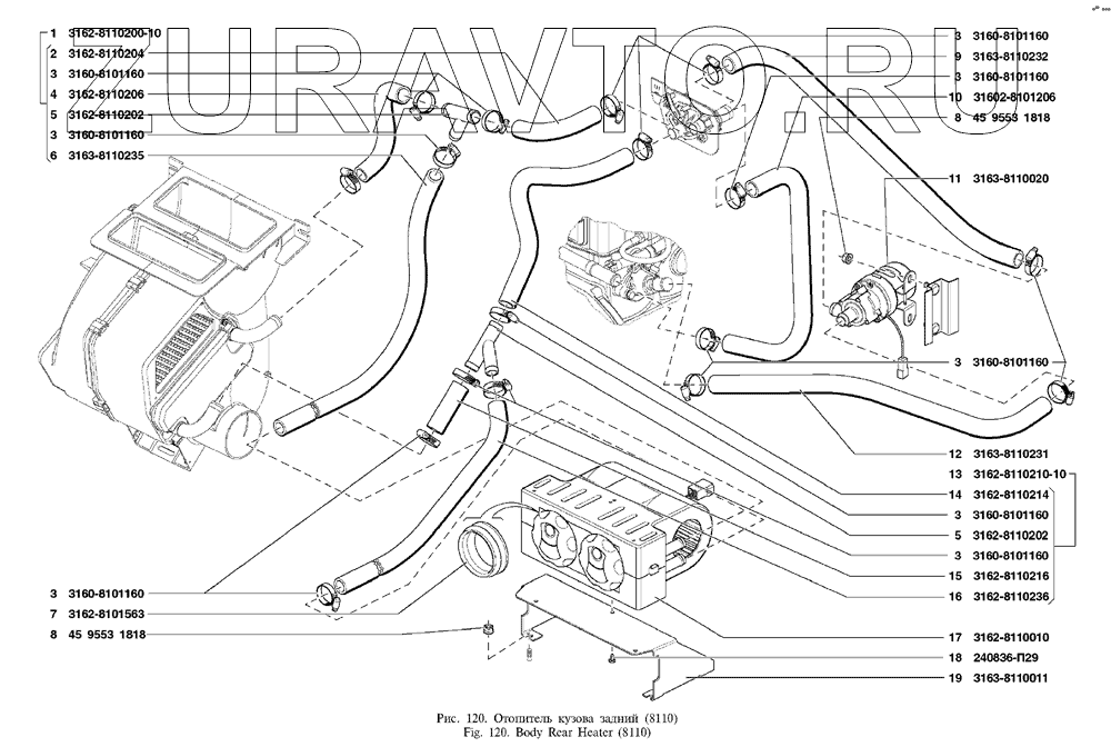 | 19 | 3163-8110011 | Кронштейн заднего отопителя кузова | Нет в продаже |